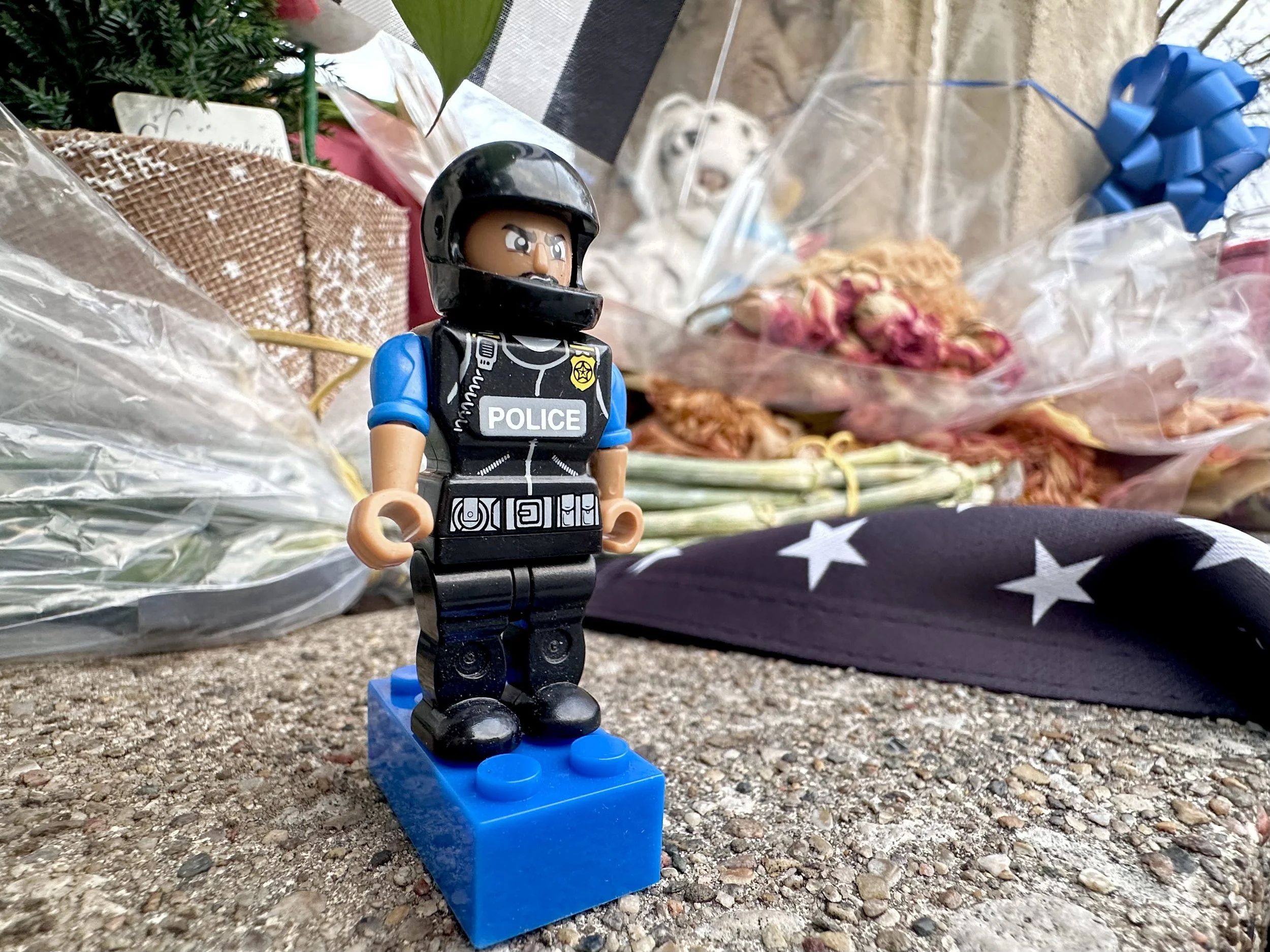 At the temporary memorial to a fallen police officer a lego police officer appeared after many days of growing larger and larger with bouquets of flowers. This small toy changed the feel.