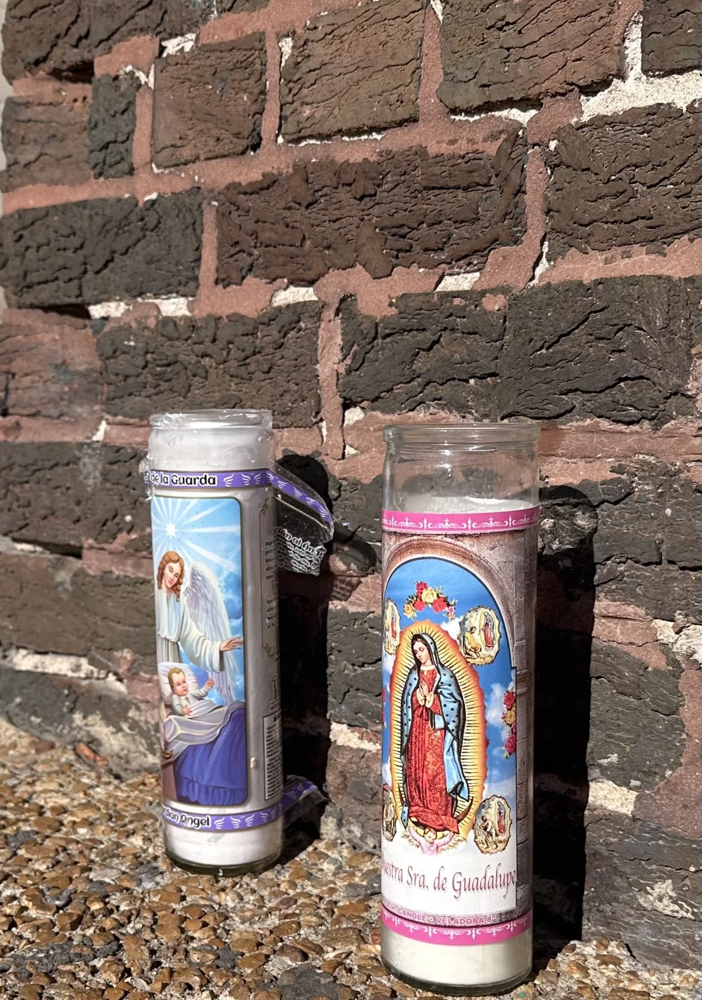 Detail image of two memorial candles outside a bodega for two shooting victims.